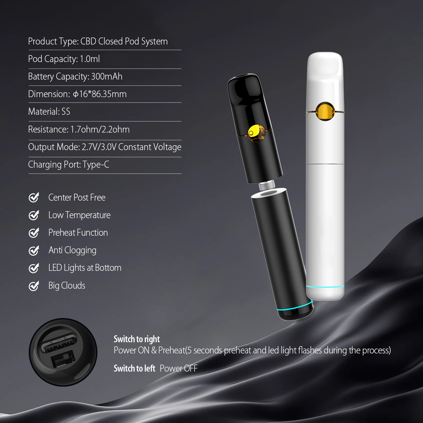 With USB Type-C charging, and the standardised 510 thread, the battery can be re-used time and time again by only replacing the screwable pod with a standard USB-C connection. Swapping pods can be done by simply un-screwing the old pod.