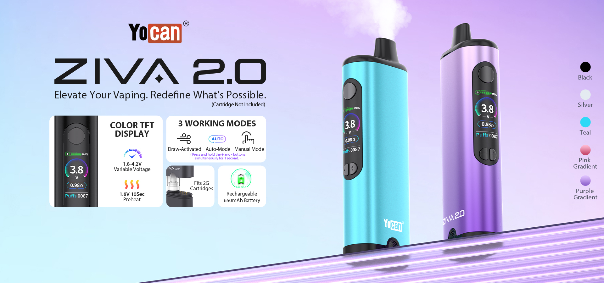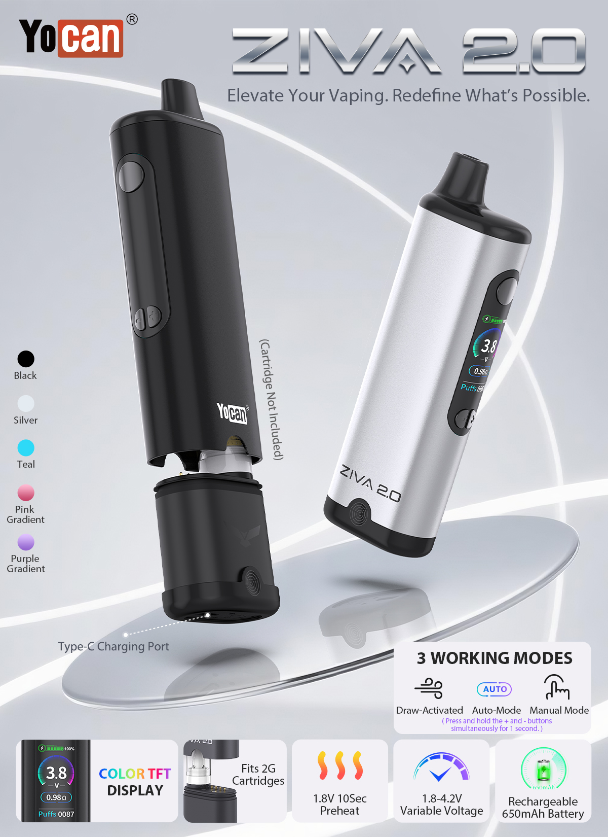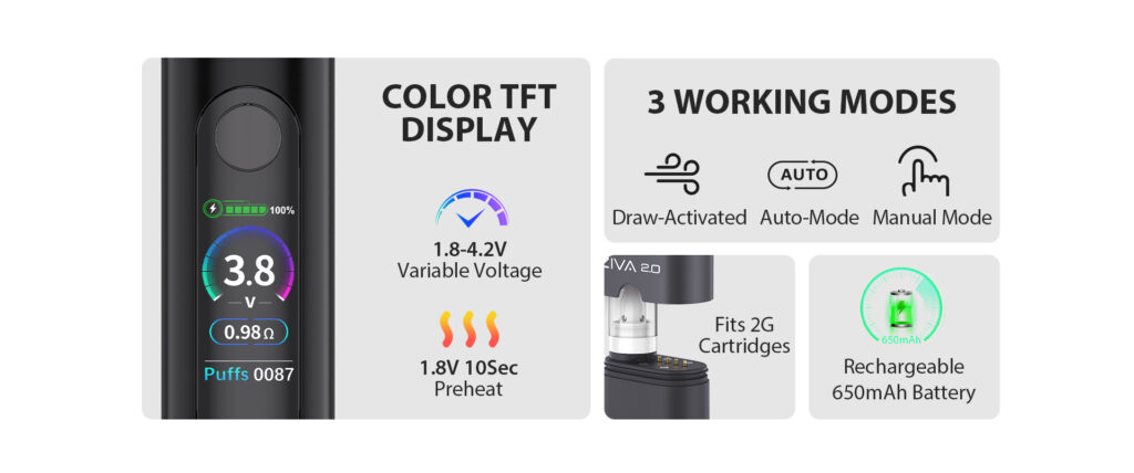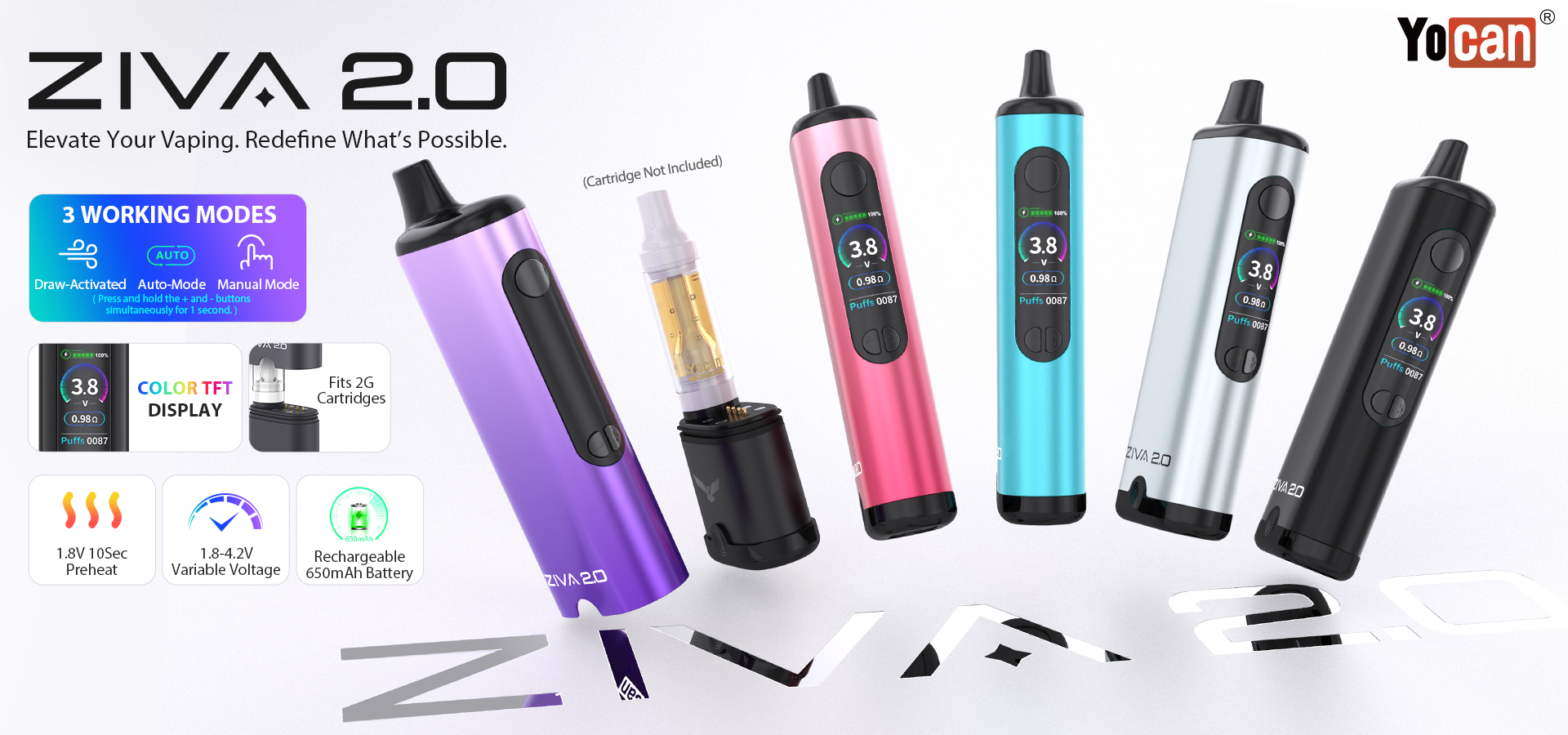 Building on their hugely successful palm size cartridge batteries, the Ziva and Ziva PRO, Yocan have introduced a great new feature set, including the new auto-draw mode, and a colour screen, in one handy package with the Yocan Ziva 2.0 battery.
