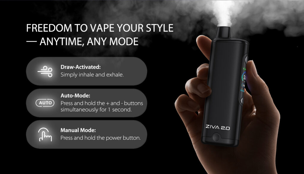 Some users find this a more comfortable way of vaping, allowing for a relaxed and constant inhale. The feature can also be convenient if sharing your device with others and wishing to minimise mouth contact, allowing for the user to have a small distance between the mouthpiece and their lips to easily increase airflow in comfortable way. The Ziva 2.0 uses a pump to activate this feature which creates a whirring sound when in use. Not recommended to activate this mode in environments where silence is needed.
